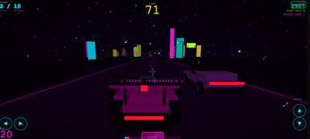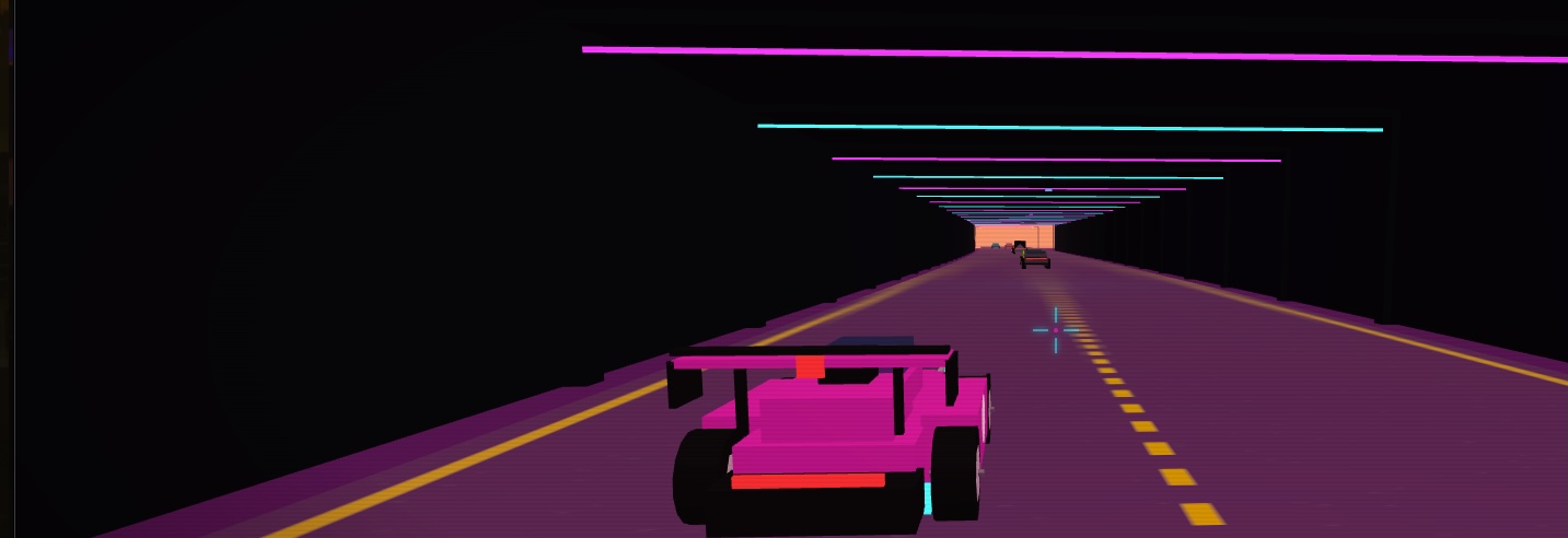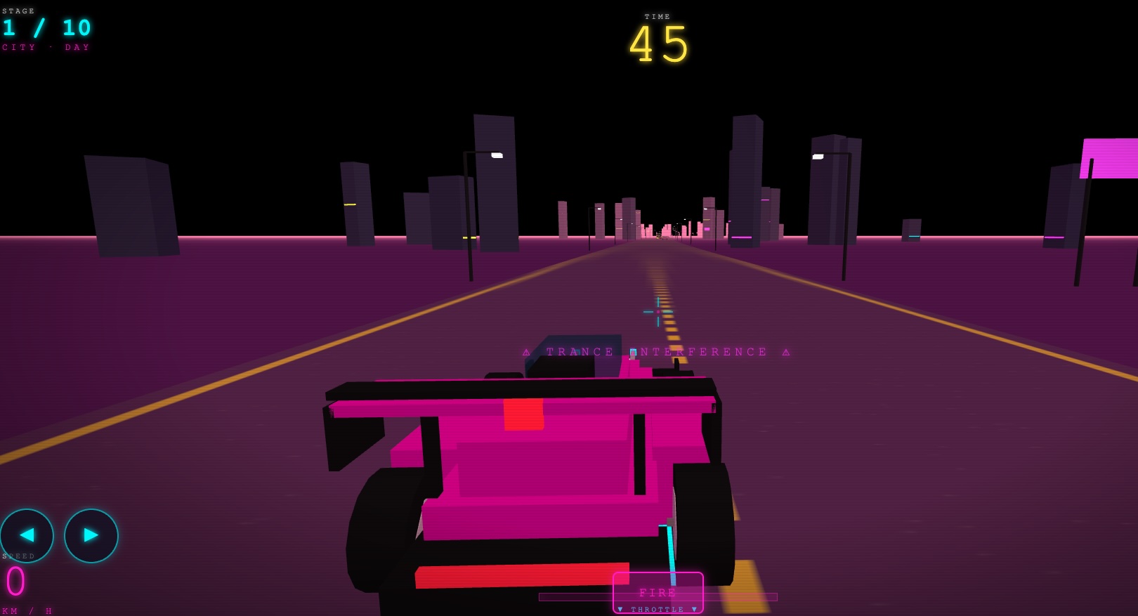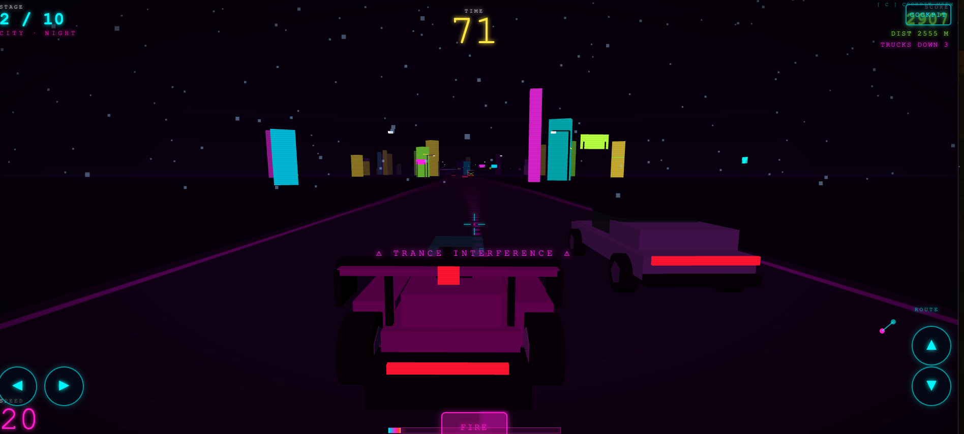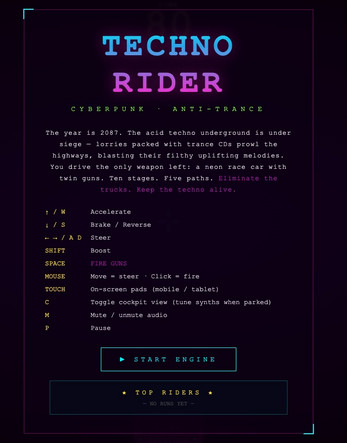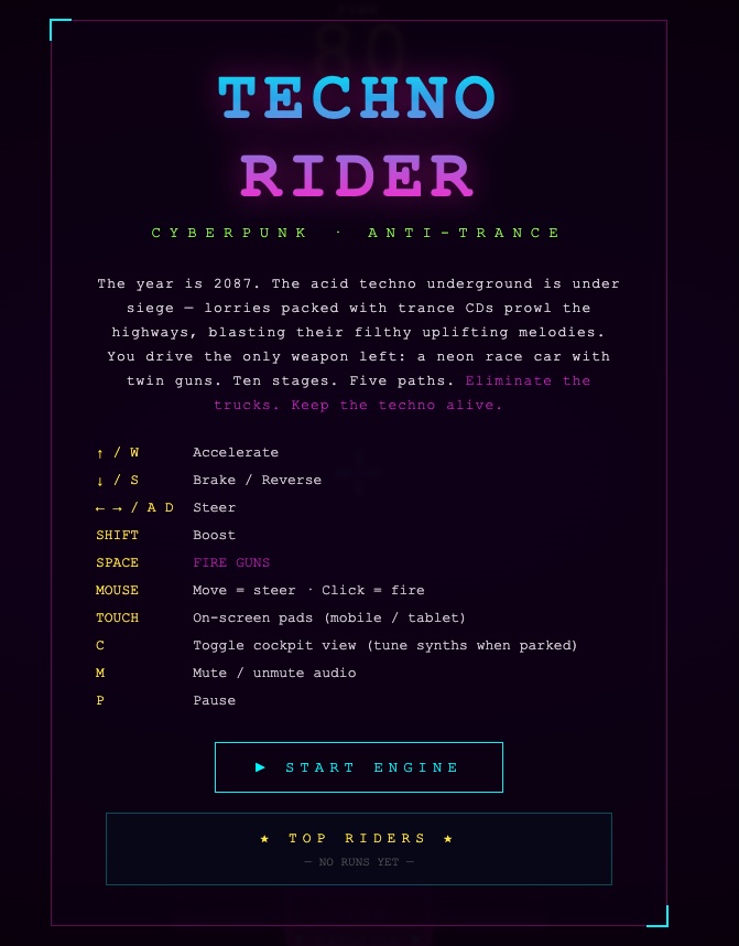 Across the neon highways, lorries packed with trance CDs prowl the night, blasting filthy uplifting melodies through weaponised sound systems. You drive the last machine capable of stopping them: a high-speed neon race car armed with twin guns, built for one purpose — keeping techno alive.